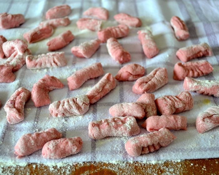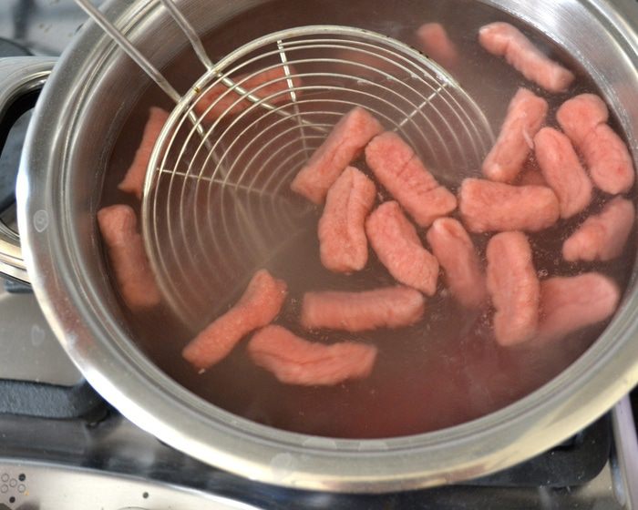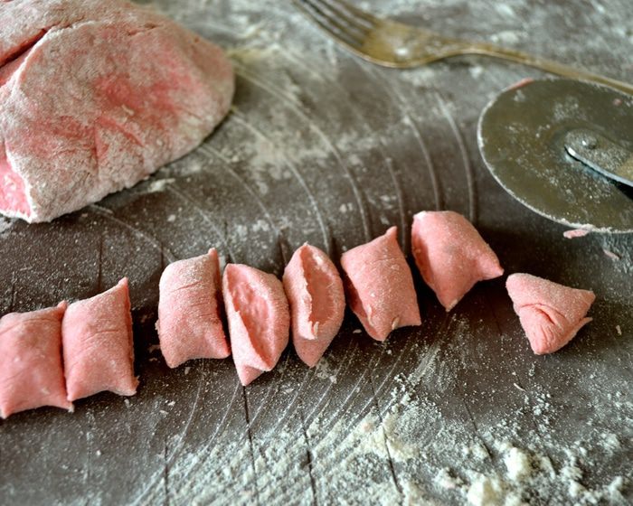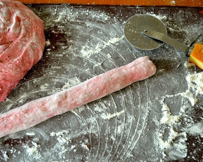 Замесить тесто, помогая себе в конце руками. У вас может уйти и чуть больше муки... Но, главное, как я указала в предисловии к рецепту, использовать для ньокков очень крахмалистую картошку, иначе тесто не сформируется, вам придется постоянно подсыпать муку, в итоге, ньокки получатся "деревянными"!