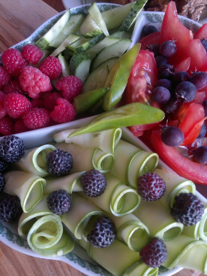 Помыла, порезала овощи, красиво разложила на тарелке. Посолила, поперчила, добавила оливковое масло и гранатовый соус. Теперь очередь за ягодами. Получилось очень аппетитно! Угощайтесь, всем хватит!