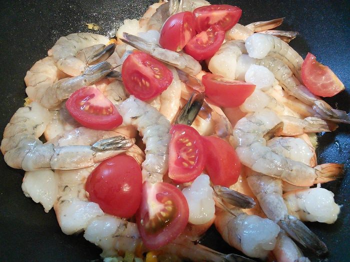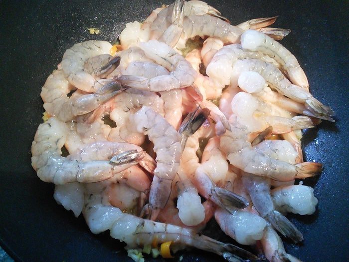 Мелко порубите чеснок, имбирь, чили. Разогрейте оливковое масло со сливочным и забросьте овощи, через минуту очищенные креветки ( их надо промыть, вычистить кишку и снять панцирь ( мы оставили хвостики)).