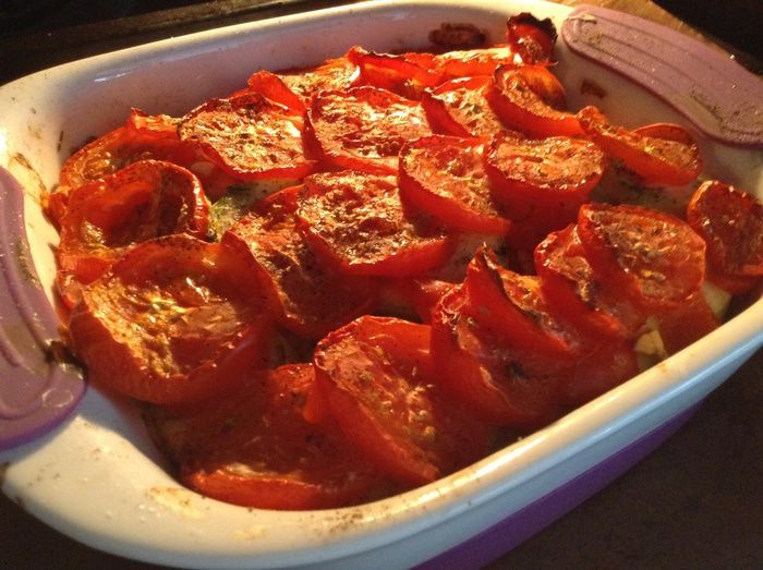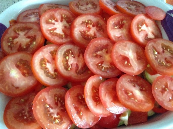 Нарезать кружочками томаты, выложить сверху и еще раз посолить, посыпать молотым перцем, полить оливковым маслом.