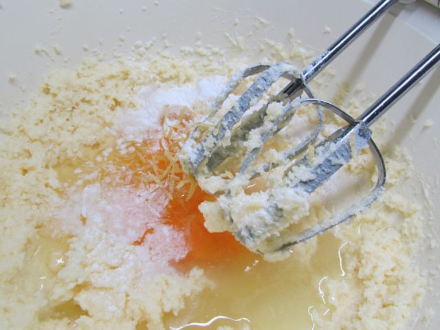 Добавить разрыхлитель, сок и цедру лимона, яйца. Всё хорошо перемешать до однородности.