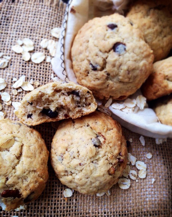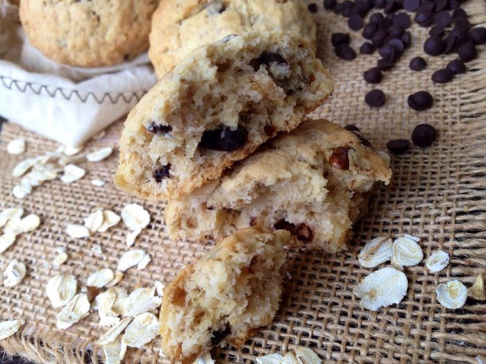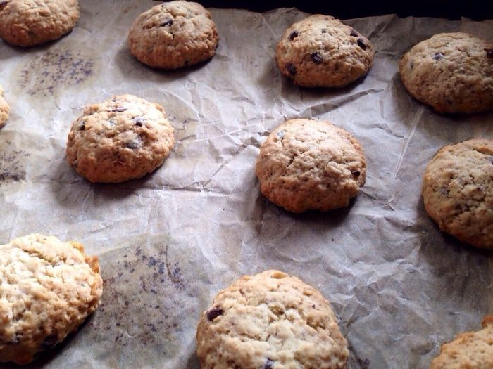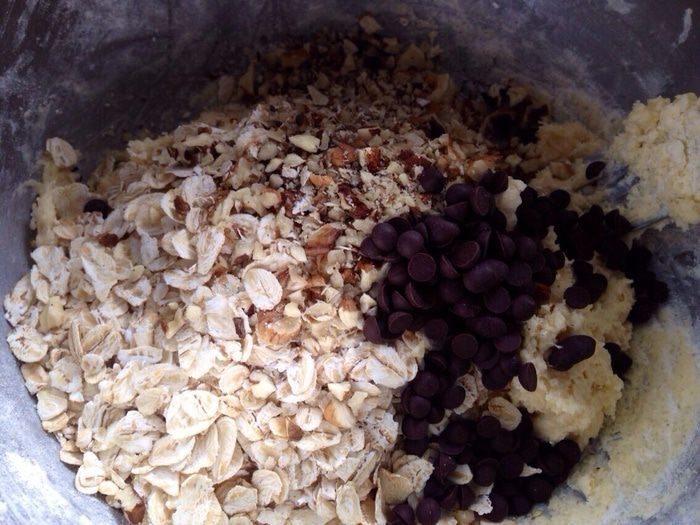 Затем всыпать овсяные хлопья, грецкие орехи и горсть шоколадных капель. Перемешать.