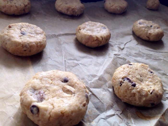 Сформировать из теста небольшие шарики и выложить на противень, застеленный кулинарной бумагой, на расстоянии 5 см. друг от друга.Чуть их придавить пальцами.