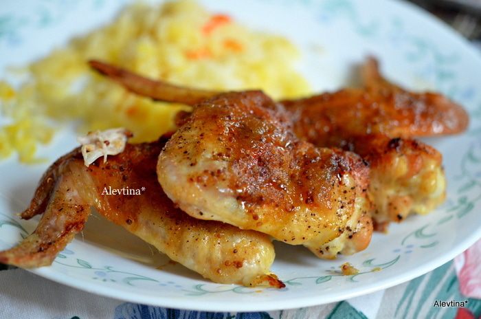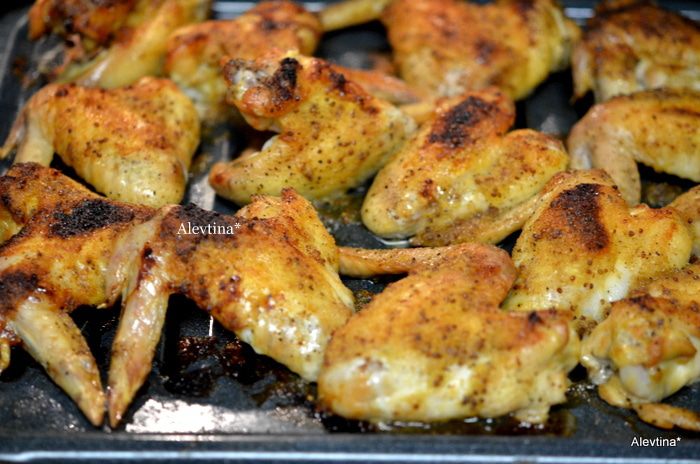 На противень выкладываем куриные крылышки.Сбрызнем оливковым маслом, посолим и поперчим. Поставим в духовку разогретую на 200 гр. Готовим примерно 45 мин.