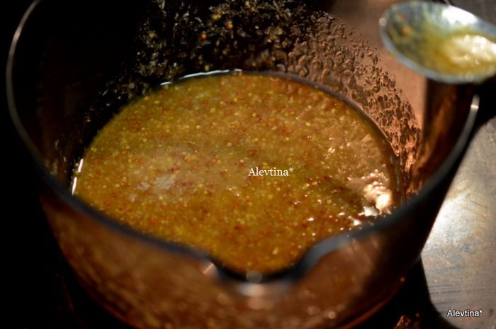 В это время смешиваем в кастрюле небольшой все для глазури. Ставим на огонь, помешиваем 2 мин. или ждем как чуть подогреется и разойдется мед, хрен и горчица.