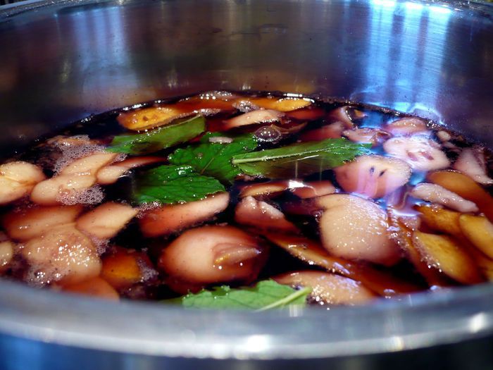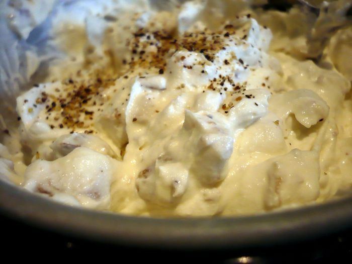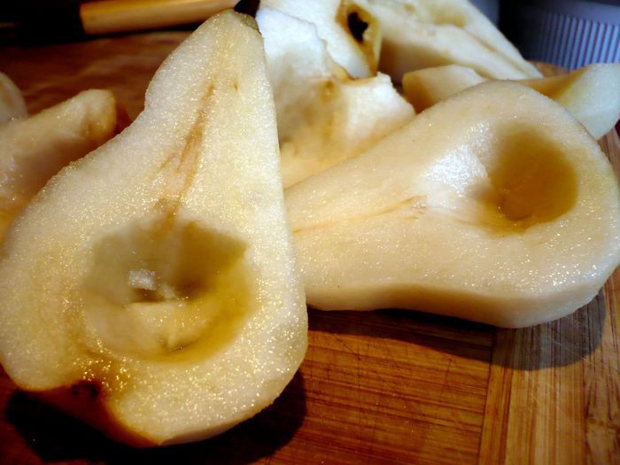 Процеживаем жидкость через сито. Укладываем в сотейник с широким дном груши, сверху заливаем их винным бульоном. Доводим до кипения и варим на небольшом огне не более 8 минут. Если вы хотите, чтобы груша была более упругой при подаче, сократите время варки до 6 минут после закипания. Для фарширования смешиваем творог с маскарпоне, добавляем порубленый орех и 1 ст.л. сока апельсина, черный перец, снова перемешиваем.