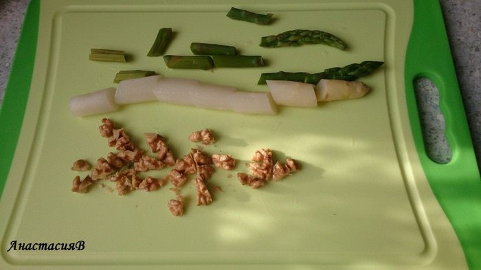 Спаржу помыть. У белой спаржи почистить кожуру и отрезать 1 см от ножки, у зеленой только отрезать немного от ножки. В кипящей подсоленной воде