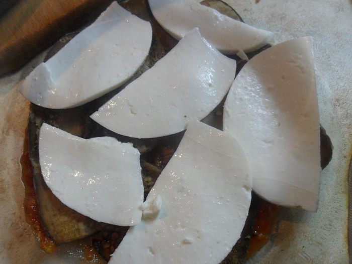 Полить томатным соусом и уложить еще слой баклажанов с томатами, а сверху опять слой моцареллы.