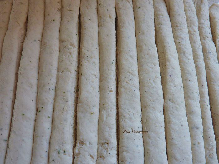 Разрезать на полоски, удобно это сделать роликом для пиццы, но можно и ножом.