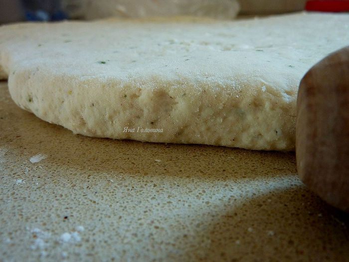 Раскатать тесто на слегка присыпанной мукой поверхности. Раскатывать толщиной в сантиметр.