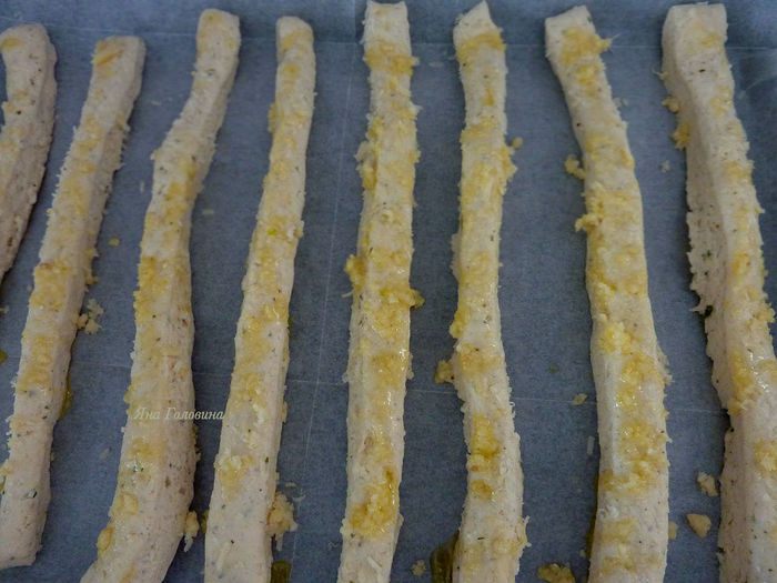 Разложить палочки на противень, покрытый бумагой. Запекать минут 20 до золотистой корочки.