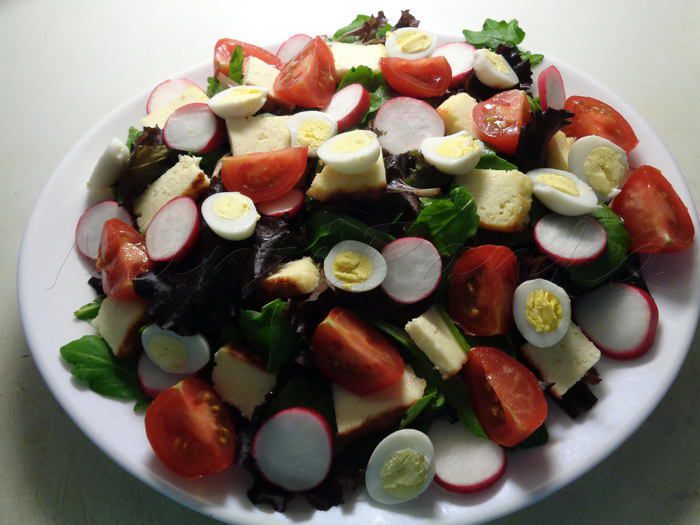 Все порезанные овощи и яйца выложить поверх салата.