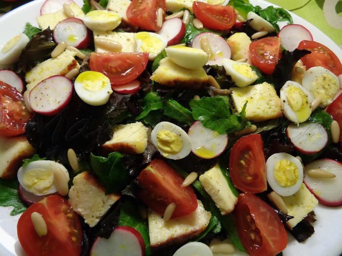 Украсить салат кедровыми орешками. Посолить и поперчить.