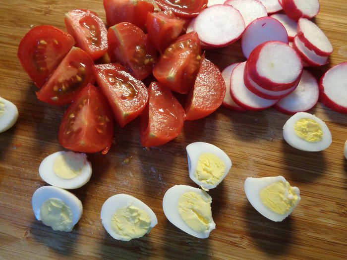Редиску (у меня крупных 4 штуки) порезать кружочками. Помидоры черри (у меня крупные) на четвертинки, а сваренные вкрутую перепелиные яйца порезать пополам.