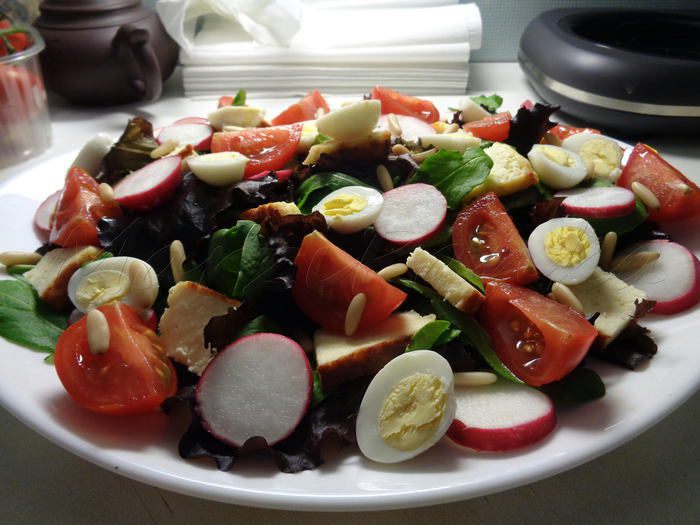 Этот салат я придумала сама. Соединила все, что мне нравится, учитывая сочетаемость продуктов. Также использовала в качестве заправки салата весьма полезные для здоровья и красоты масла грецкого ореха и авокадо. Украсила салат не менее полезными перепелиными яйцами и кедровыми орешками.