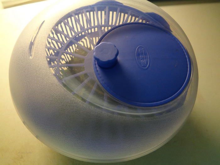 Помыть салат и обсушить с помощью бумажных полотенец. Я сушу в такой вот центрифуге.