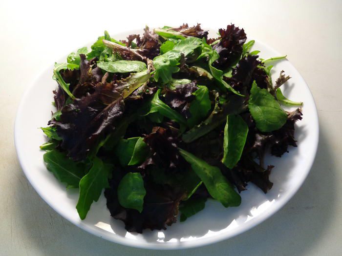 Залить смесь салатов холодной водой. У меня микс такой: рукола, беби-шпинат, мелколистовые - салат лолло росса, красный салат ромэн и батавия. Можно взять любую салатную смесь. Чем больше видов салатов, тем вкуснее.