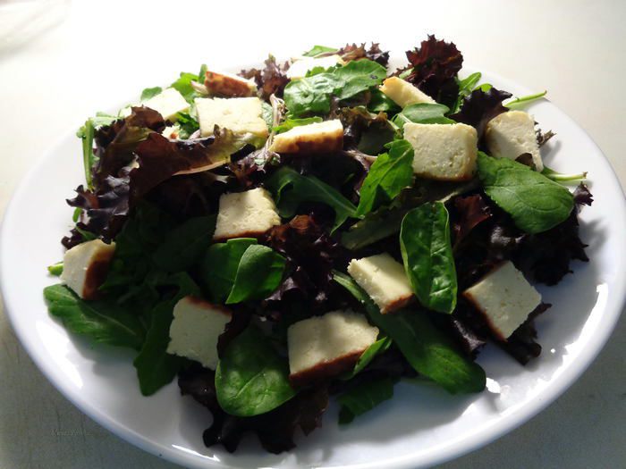Порезать жареный сыр на небольшие кусочки и выложить его поверх салата.