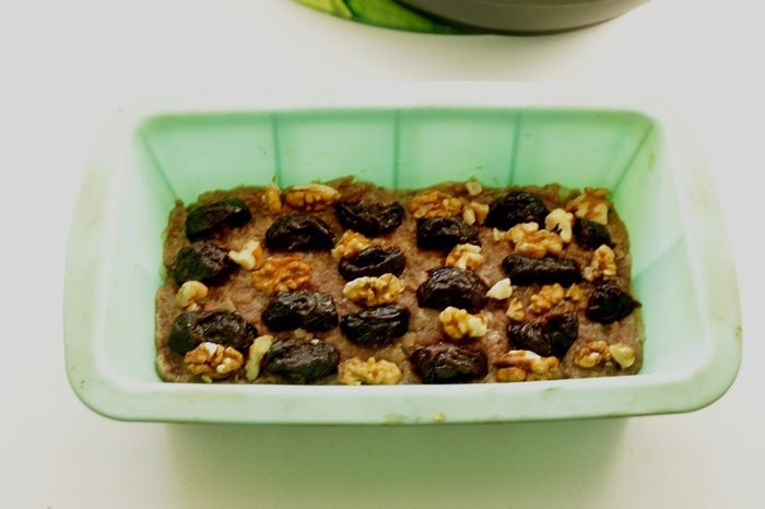 В форму кладем половину фарша. Сверху укладываем орехи и чернослив.