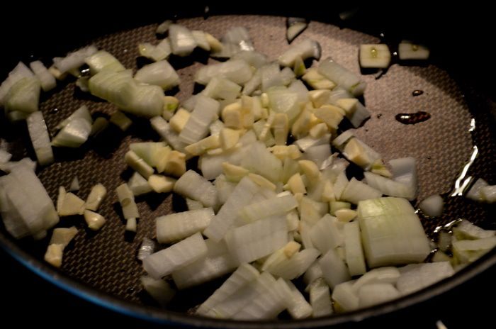 На большой сковороде разогреть оливковое масло. Добавить лук и чеснок и готовить примерно 5 мин.помешивая.