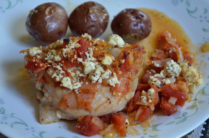Готовые части курицы подаем с фетой и помидорами и выбранным гарниром.
