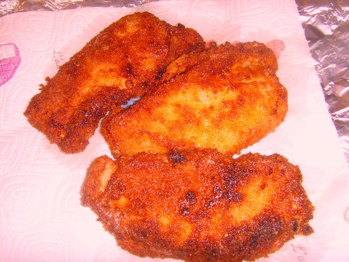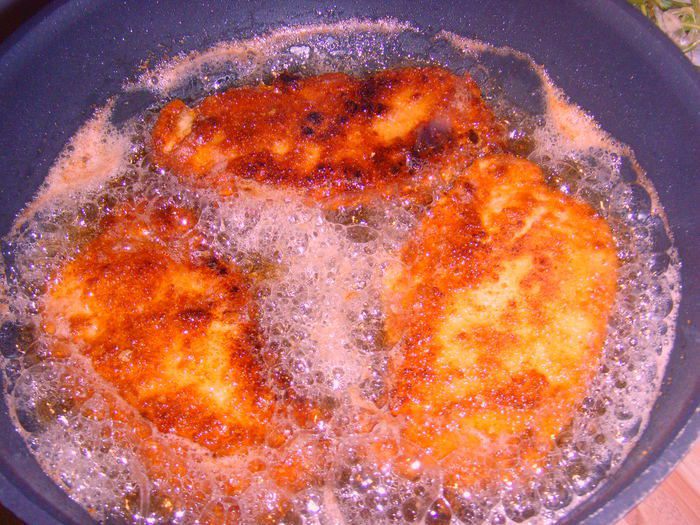 Жарить необходимо в большом количестве разогретого масла, чтобы шницеля в нём плавали. Так у вас шницель обжарится равномерно и образуется золотистая хрустящая корочка.