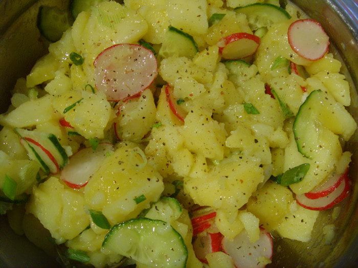 Теперь о картофельном салате: он в корне отличается от привычного нам салата. Картофель (желательно разваристых сортов) отварить " в мундире". Приготовить соус: горячий смешать бульон ( можно овощной или любой мясной ) с уксусом, солью, сахаром. Соус держать горячим.