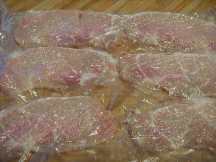 С обеих сторон, довольно тонкие пласты мяса должны у вас получиться. Избегайте прорывов.