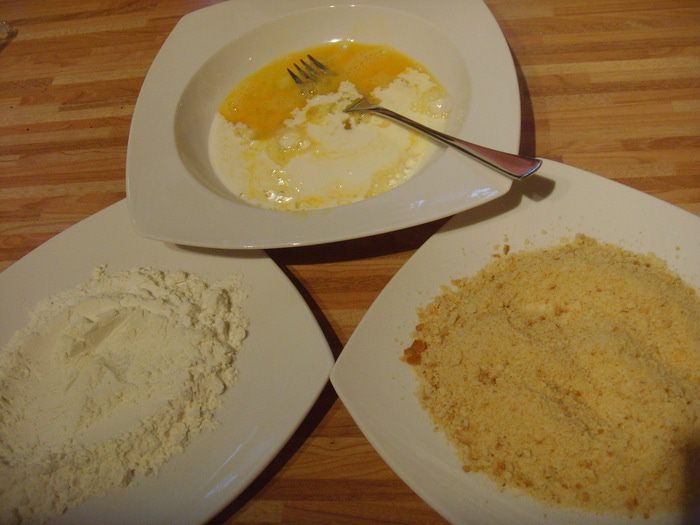 Приготовить всё для панировки: муку, сухари ( делаю сама из чёрствого хлеба), взболтать яйца и влить к ним сливки. Каждый шницель обмакнуть в муке, яйце, сухарях. Кто желает двойной панировки: окуните шницель повторно в яйце и в сухарях.