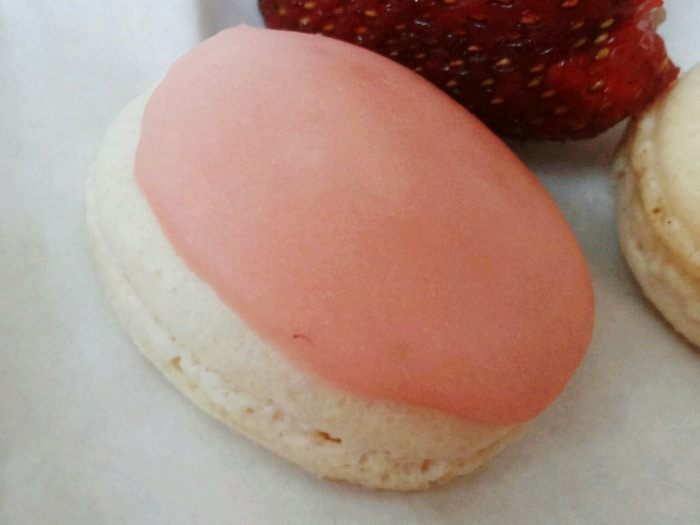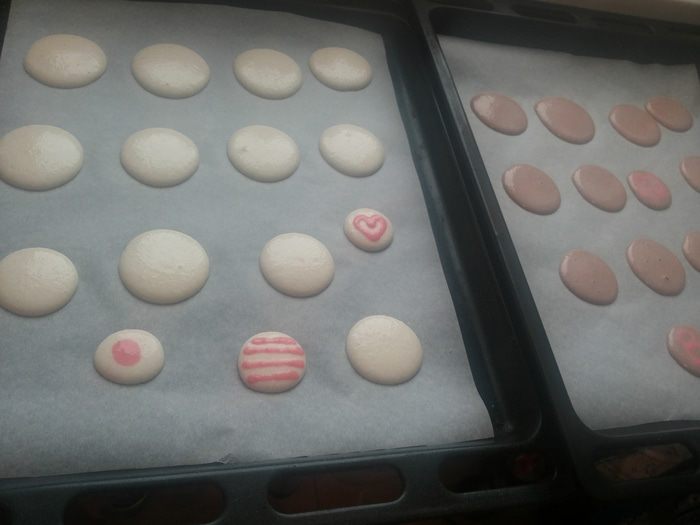 Выложите миндальное тесто в кондитерский мешок и отсадите на противень, застеленный бумагой для выпечки, кружочками диаметром 1 и 3 см . Оставите макарони на 1 час чтобы подсохли.