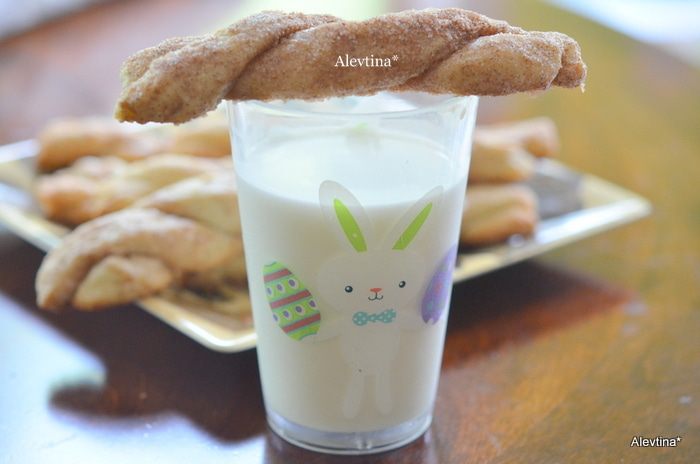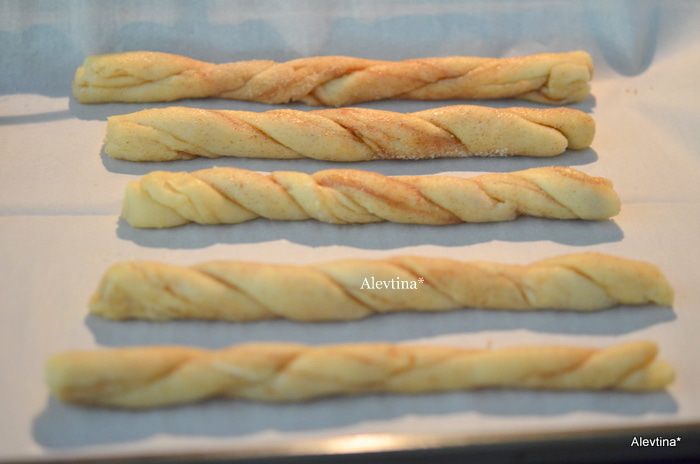 Берем полоски по 2 штуки,скручиваем отдельно аккуратно жгутом и скатываем руками на посыпанный сахаром с корицей.