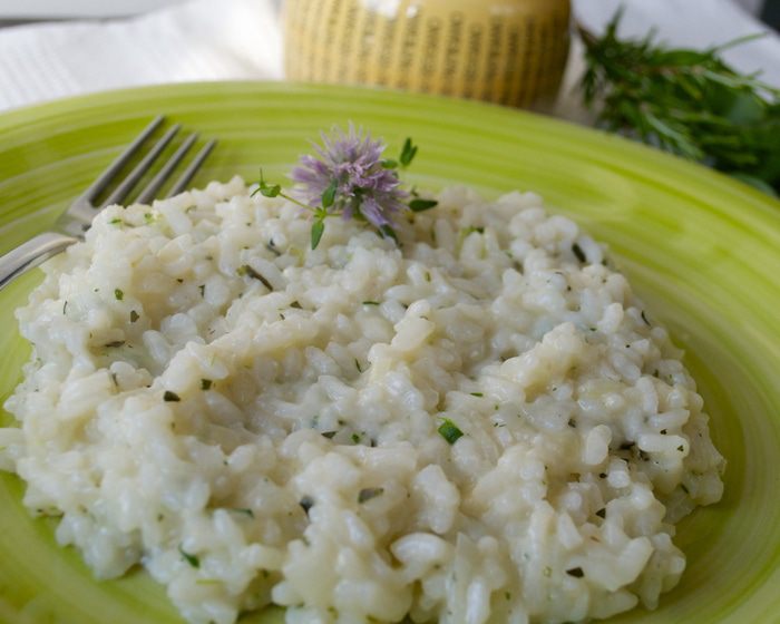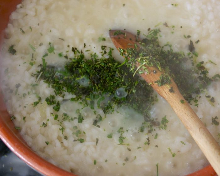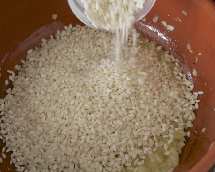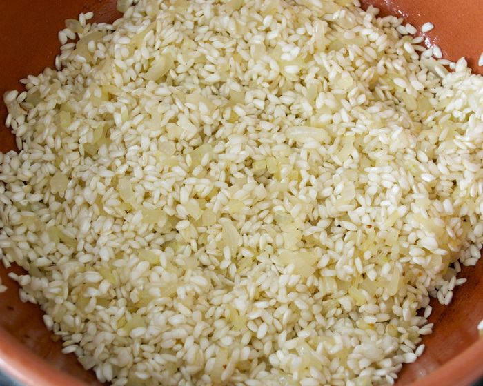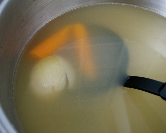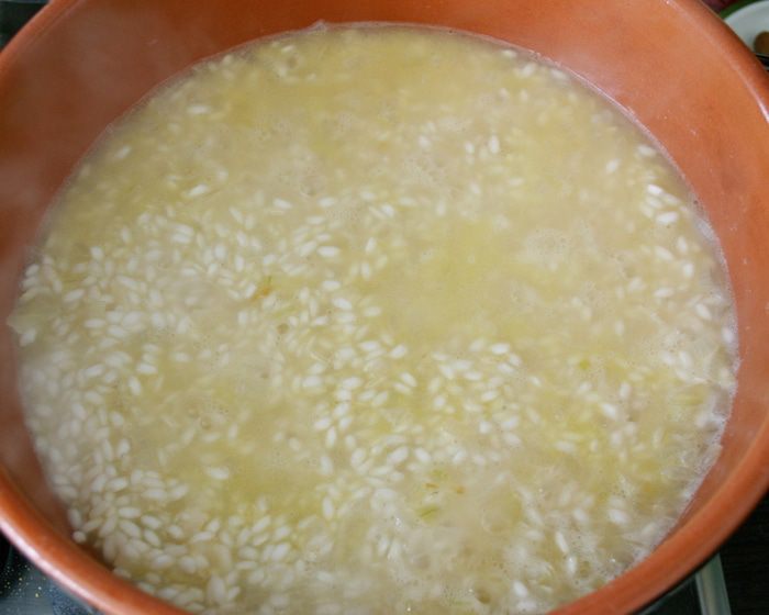 Первым делом подготовить бульон. Чаще всего я готовлю бульон по рецепту Ю.Высоцкой (из книги по детскому питанию...) Имеющиеся овощи (морковь, лук-порей, стебли сельдерея, сладкий перец - в общей сложности 500 г овощей) нарезать кубиками. Разогреть в кастрюле с толстым дном растительное масло и немного потомить в нем овощи, не позволяя овощам зажариться. Залить овощи горячей водой, добавить лавровый лист (перец горошком), любые пряные травы по желанию... Варить все около 30 минут. Готовый бульон процедить и использовать по необходимости. А если готового бульона у Вас нет, и времени готовить его тоже нет... А приготовить ризотто все-таки хочется, можно просто поставить на огонь кастрюлю с водой. Положить в нее очищенные и нарезанные морковь, лук, сельдерей и готовить минимум минут 20. Затем можно сразу использовать для приготовления ризотто!