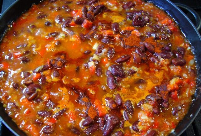 Затем добавить в сковороду помидоры, паприку и фасоль. Я взяла томатный продукт от Tomato Gusto, в нем – только свежие томаты, соль, лавровый лист и семена укропа.