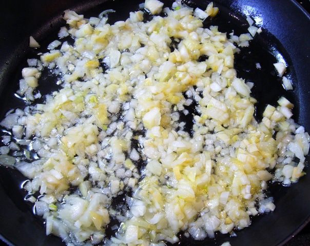 В сковороде разогреть оливковое масло, выложить нарезанные лук и чеснок, довести лук до прозрачности.