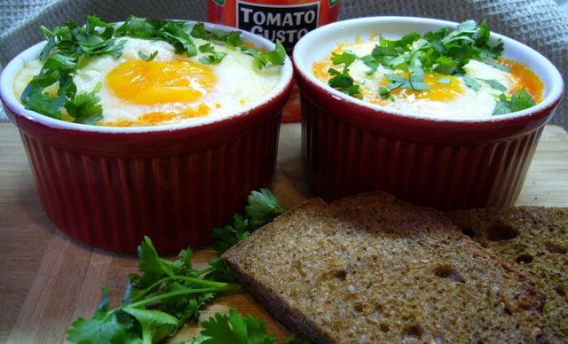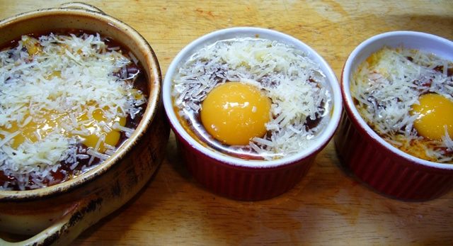 Керамические формочки смазать оливковым маслом, выложить томатно-фасолевый соус, сверху разбить яйцо, посыпать тертым сыром.