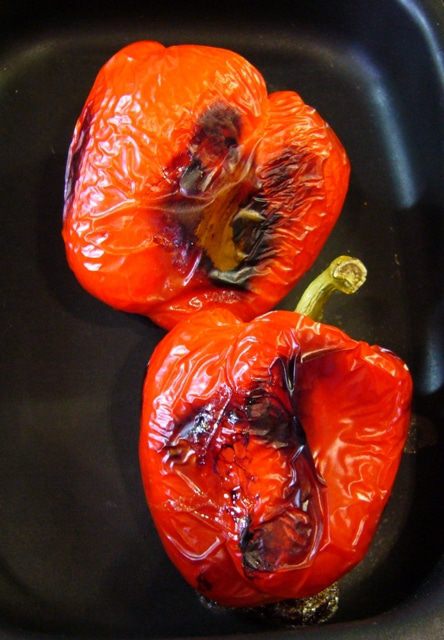 Духовку разогреть до 220 град, запечь перцы, дав им слегка почернеть.