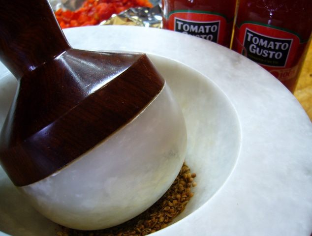 В ступке растереть зиру и кориандр. Всыпать в сковороду вместе с перцем чили. Готовить 2 мин.