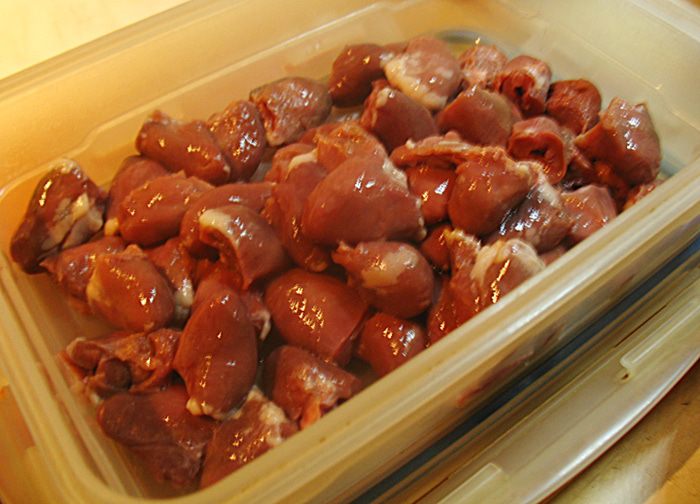 Сердечки моем и очищаем от жира, пленок и трубочек.