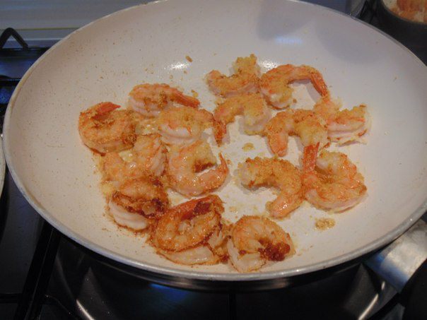 Тунца и креветки будем готовить одновременно на двух сковородах. В каждой разогреть 1,5 ст.л. оливкового масла и обжарить быстро на достаточно сильном огне до румяного цвета. Посолить.