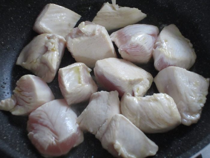 В сковороде разогреть оливковое масло и обжарить мясо.