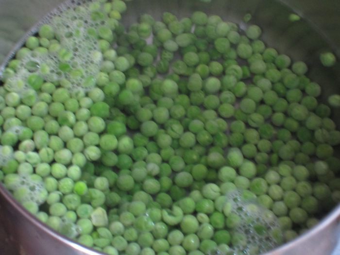 Горошек бланшировать в кипящей воде 5 минут,откинуть на дуршлаг.Опустить в холодную воду,затем снова откинуть на дуршлаг.