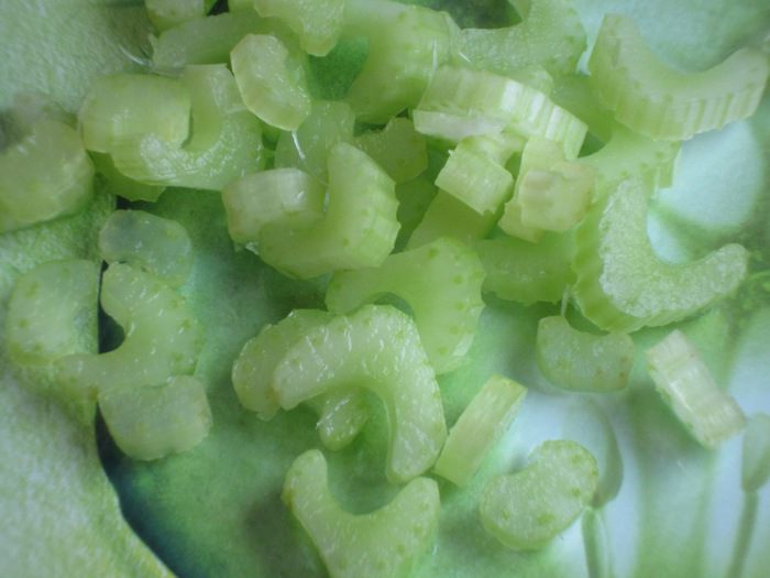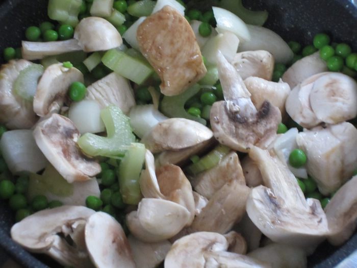 Посолить,поперчить,влить соевый соус,добавить лук,сельдерей,горошек,шампиньоны и готовить 2 минуты.Затем постепенно влить бульон ,накрыть крышкой и готовить на слабом огне 5 минут.