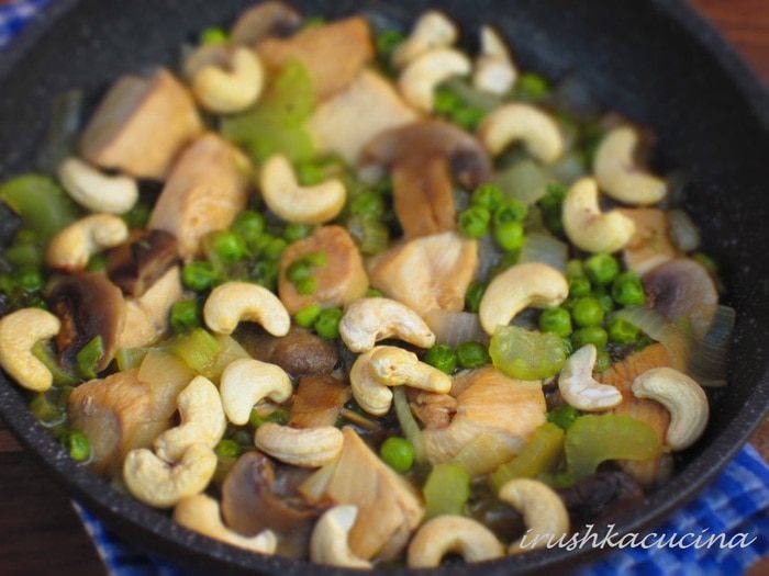 В 2 ст.л. воды развести крахмал и ввести в соус,хорошо размешать и готовить ещё несколько минут.Добавить кешью,прогреть 2-3 минуты и подавать с рисом.Приятного аппетита:))