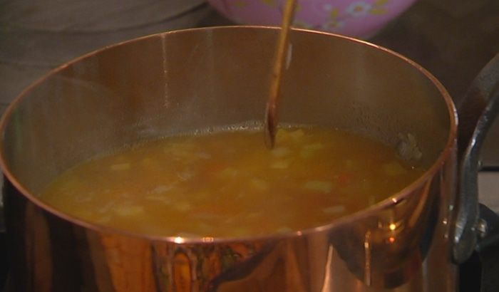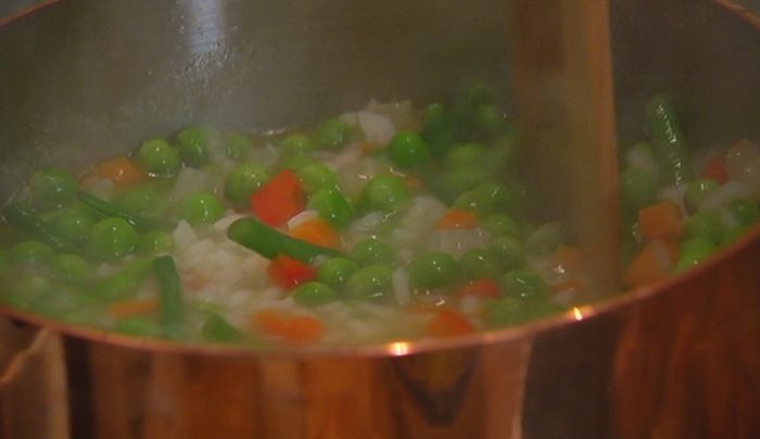 Добавить фасоль и горошек и варить еще 3–4 минуты до готовности риса и овощей, затем посолить и поперчить. Если суп получается слишком густым, влить еще немного горячей воды или бульона.