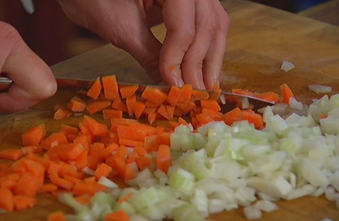 Все овощи нужно порезать так, чтобы они были примерно одинакового размера.
