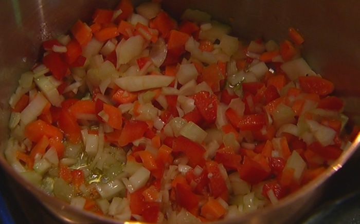 В тяжелой кастрюле разогреть 2 ст. ложки оливкового масла, выложить все овощи и обжаривать 5–7 минут, пока они не станут мягкими.