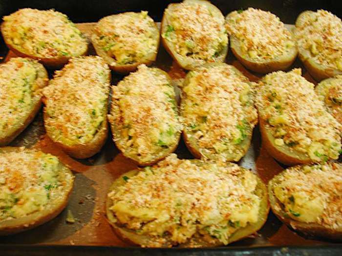 Заполненные лодочки посыпаем сухарями и пармезаном. Ставим в разогретую до 180 градусов духовку и выпекаем в течении 10-15 минут.