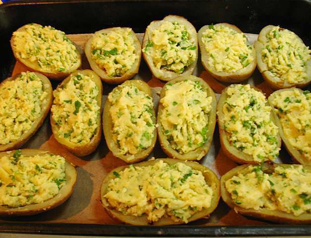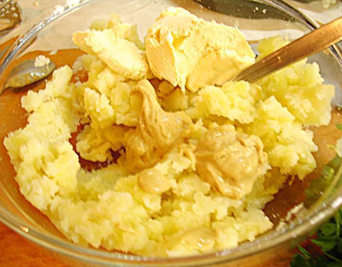 Вынутую часть картофеля размять. К размятой мякоти картофеля добавить сливки, горчицу, соль, перец. Совет горчицу кладите постепенно и ориентируйтесь на ваш вкус, в ингредиентах я указала ее не отступая от оригинального рецепта.