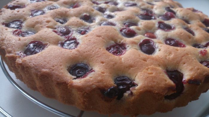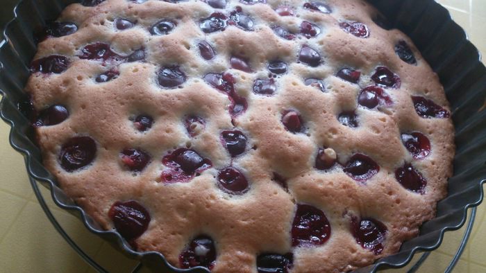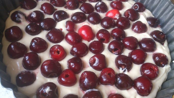 Выложить тесто в форму, сверху разложить очищенную от косточек черешню. Выпекать 30-35 минут.