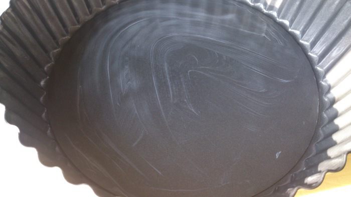 Квадратную форму со стороной 20 см смазать маслом и слегка присыпать мукой. К сожалению моя форма для этого бисквита была испорчена и я пекла в обычной круглой диаметром 22 см. Духовку разогреть до 180С.